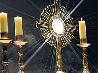 In der eucharistischen Anbetung beten wir unseren HERRN JESUS CHRISTUS an, der in der Gestalt des Brotes auf geheimnisvolle Weise mit Fleisch und Blut in seiner ganzen Gottheit und Menschheit verborgen ist. (vgl. Joh 6, 22-71).