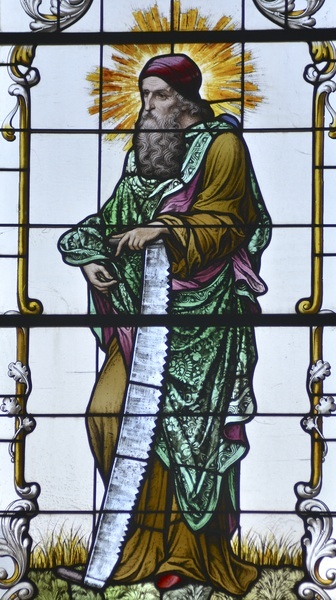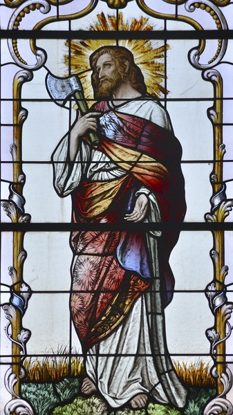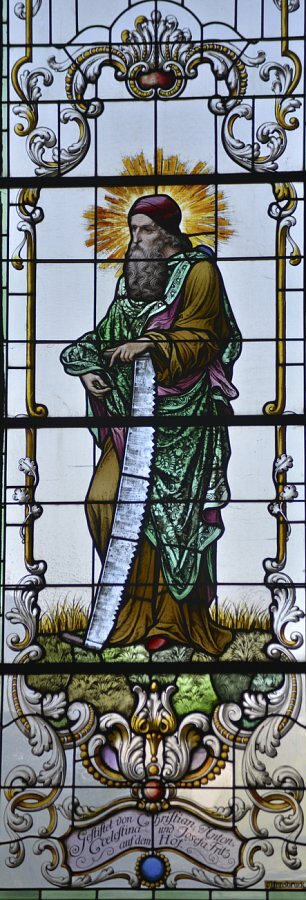 Apostel als Patrone für die Handwerker, Zimmerleute, Matthias mit Beil und Simon mit Säge; durch Beil und Säge konnte sich die lokale Bevölkerung gut mit den Aposteln identifizieren.