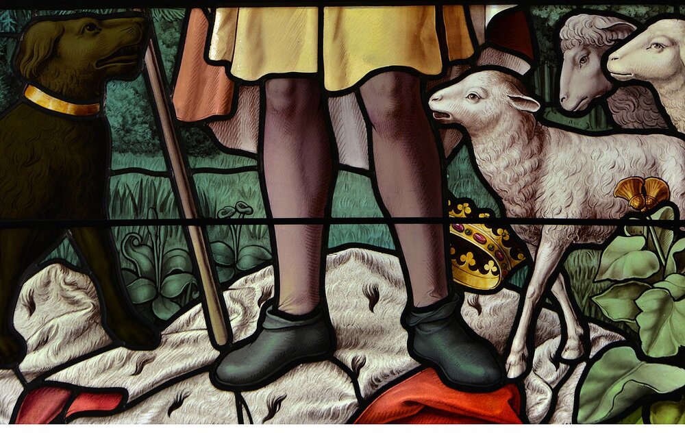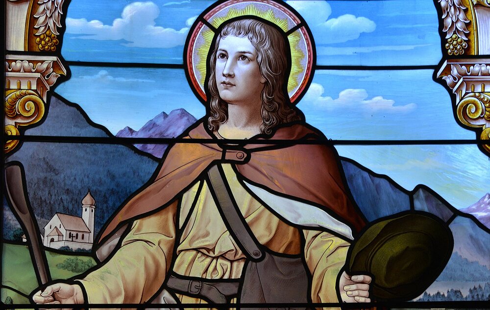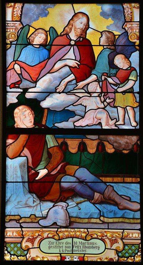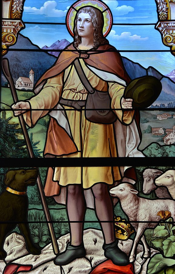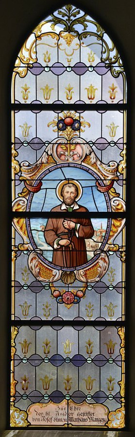 Glasgemälde im Chor, links hl. Wendelin, rechts hll. Martin und Isidor